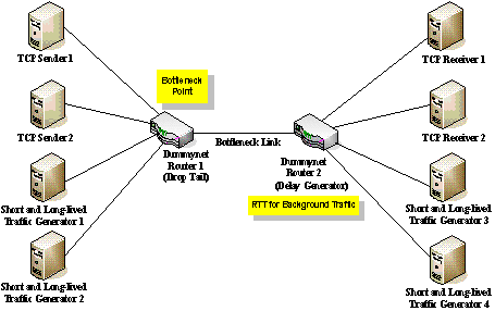 An extension of dummynet is used in the second router to assign per-flow delays to long-lived as well as short-lived background traffic flows. This configuration gives all packets from a flow the same amount of delay randomly sampled from a distribution. We use the distribution of RTT obtained from a measurement study [14].