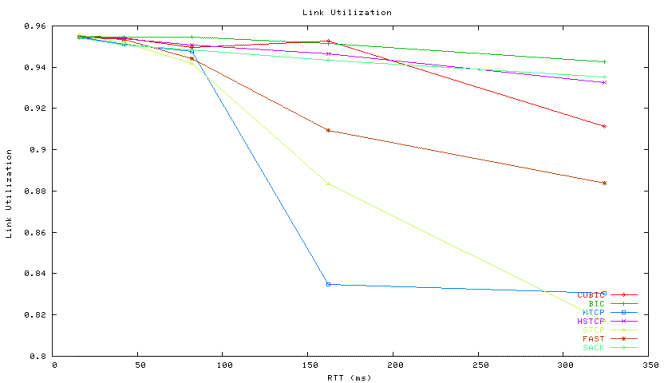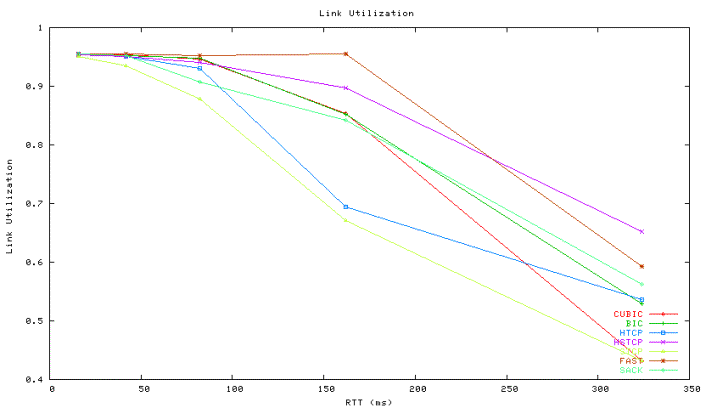 Below Figure 2 shows the results of experiments where we run one flow of a high-speed TCP protocol along one regular TCP-SACK (SACK) flow while we vary the RTT of the high speed TCP and TCP-SACK flow from 16ms to 324ms. The buffer size of the bottleneck router is fixed to 2Mbytes. Under 324ms RTT, this buffer size amounts to roughly 12% of bandwidth and delay product (BDP) of the network. All protocols drop their utilization below 65% under 324ms RTT. This is because the window size (cwnd) and its variance of the high speed TCP flow begin tested (except for TCP-SACK) are too large to be accommodated by such buffer. Under 324ms, the maximum window size of high speed flows is larger than 10,000 packets (which is around 20Mbytes).