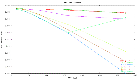 The utilization ratio under 324ms RTT has enhanced up to 94-95% for HSTCP, CUBIC, BIC, FAST and TCP-SACK. This change in utilization confirms the recent work by Appenzeller et al. [16] that the high statistical multiplexing in the bottleneck link (i.e., high randomness) permits use of small buffers. Note that there is enough background traffic to consume all the link capacity even without high speed TCP flows. These background flows are generated by TCP and their transmission rates are elastic to the amount of traffic in the network to the extent limited by the maximum allowed by 64KB receiver buffer size.