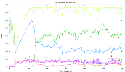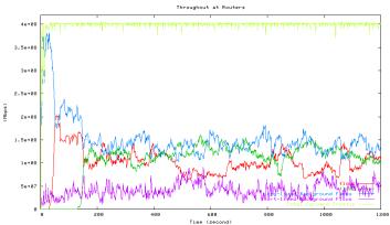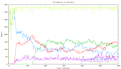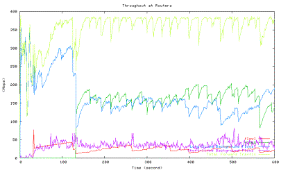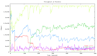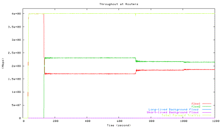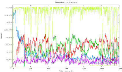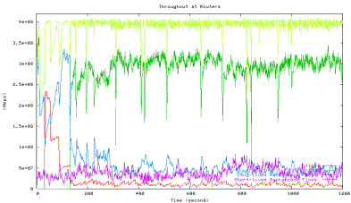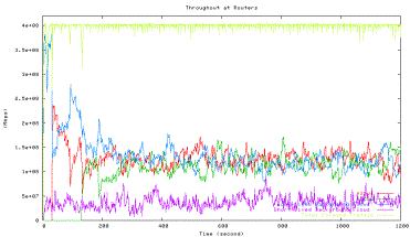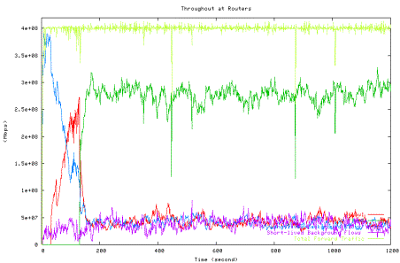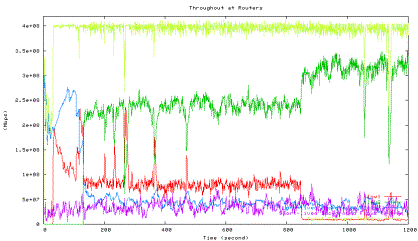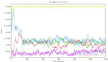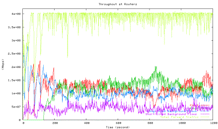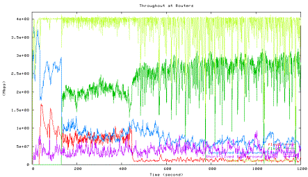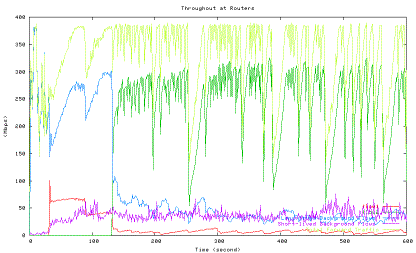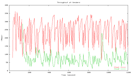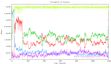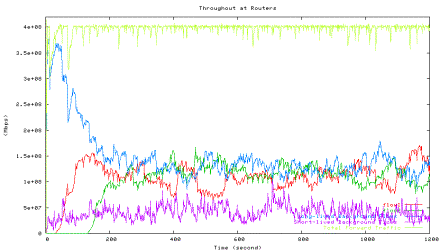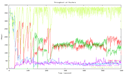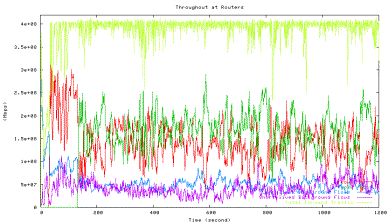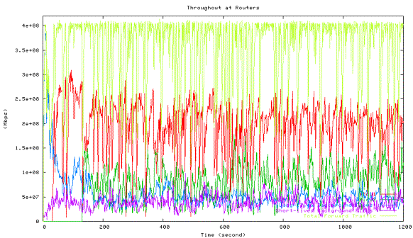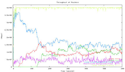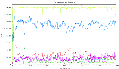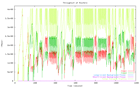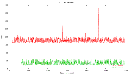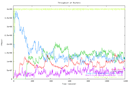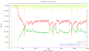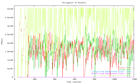 Figure 6 shows the average utilization of each traffic type measured in the second experiment when one HTCP flow with RTT 164ms (red line) competes with the other HTCP flow with RTT 42ms (green line), which corresponds to the 42ms point in Figure 5 above. The high level of fluctuations in the total link utilization (marked light yellow line) is clearly visible.