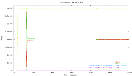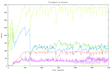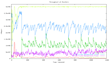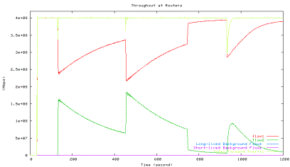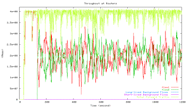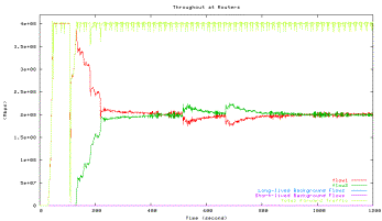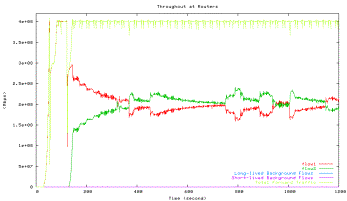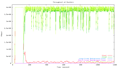 Green line: HTCP with 42ms, Blue line: long-lived background TCP flows, Purple