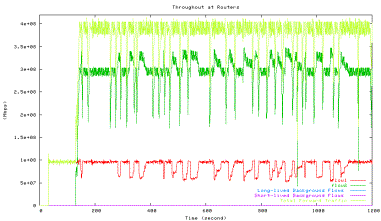 There are several reasons why background traffic is important in protocol testing. First, network environments without any randomness in packet arrivals and delays are highly susceptible to the phase effect [25], a commonly observed simulation artifact caused by extreme synchronization of the network flows on the end-to-end path. A good mix of background traffic with diverse arrival patterns and delays reduce the likelihood of the phase effect. Second, a high degree of statistical multiplexing is often assumed in protocol design. For instance, the inventors of HSTCP and STCP rely on statistical multiplexing for faster convergence. So criticizing these protocols for slow or no convergence under environments without background traffic as done in [8] is unnecessary. As today’s Internet contains a high degree of statistical multiplexing, testing under no or little background traffic does not capture the actual intended behaviors of protocols in production networks. Third, as much as background traffic can influence the behavior of the protocol flows being observed, the statistical behaviors of this “passing-through” aggregate traffic can also be significantly altered by the nature of the protocols flows being tested. Thus, measuring the statistical properties of the background traffic in the middle of the network enables us to study the impact. This impact is important from the perspective of fairness or backward compatibility of the protocols.