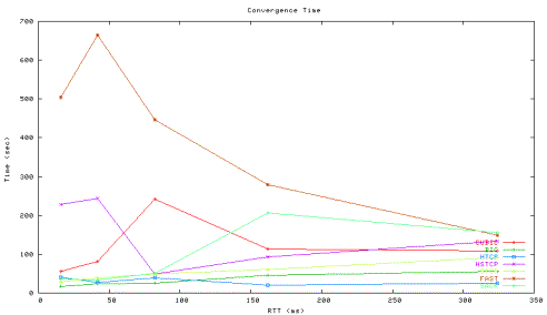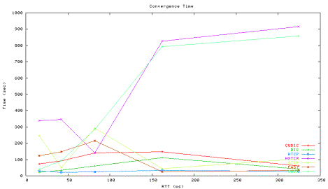Figure 35 measures the convergence time of two high-speed protocol flows that are started at different times. The convergence time is defined to be the elapsed time when the timed average throughput of the second flow reaches 80% of the first flow (recall from section 2 that the two flows are started at 30 and 130 seconds). The average throughput is obtained at one second interval. The convergence time shown in Figure 40 allows us to discuss quantitatively the dynamic behaviors of protocols that we already qualitatively pointed out above.